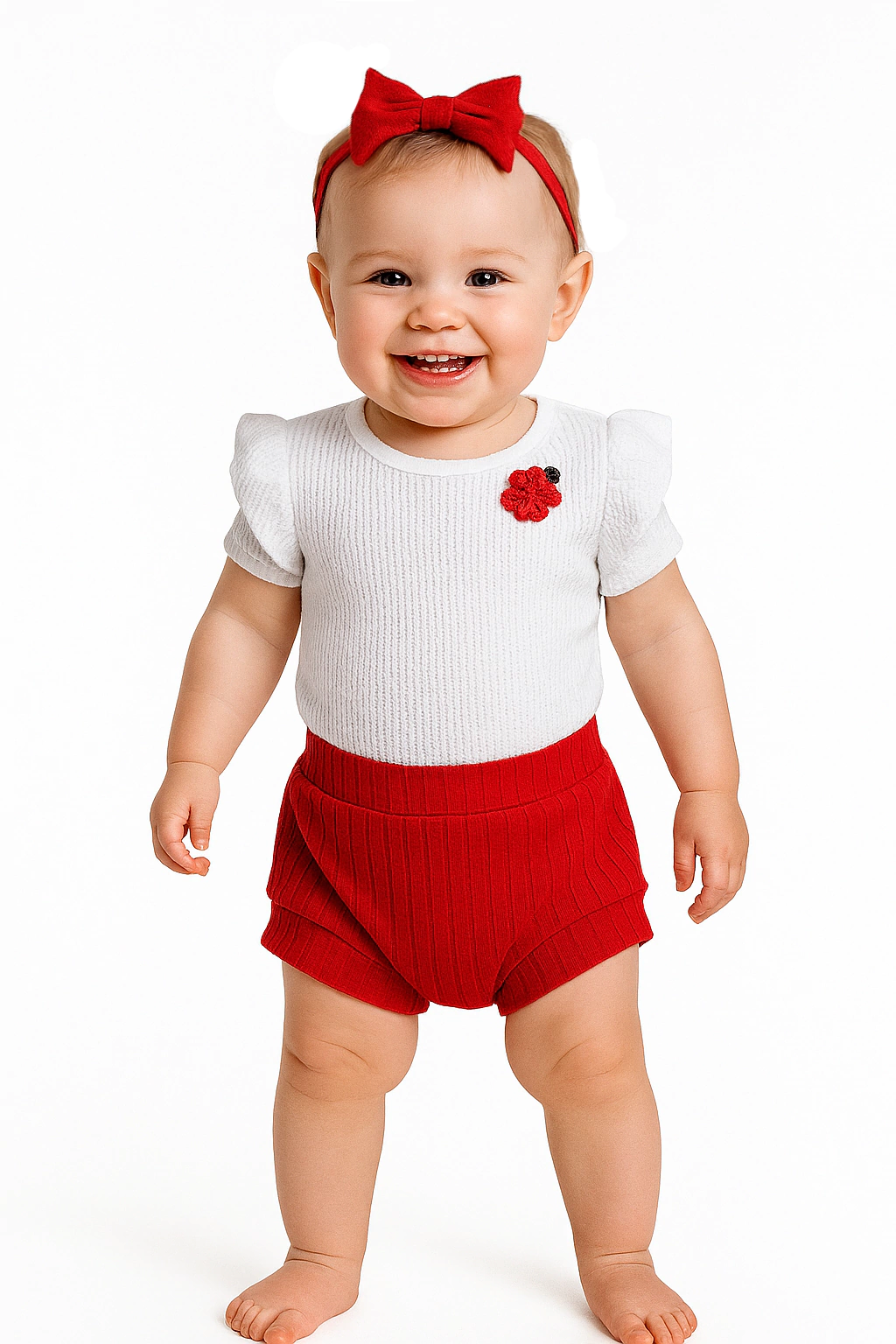 Conjunto de 3 Piezas: Remera tela Waffle con voladitos y Flor bordada en Crochet + Bombacha de Morley + Vincha con Moño Rojo. Super fresco, especial para el verano. Ideal para una ocasión especial de festejo. Calidad Premium.
