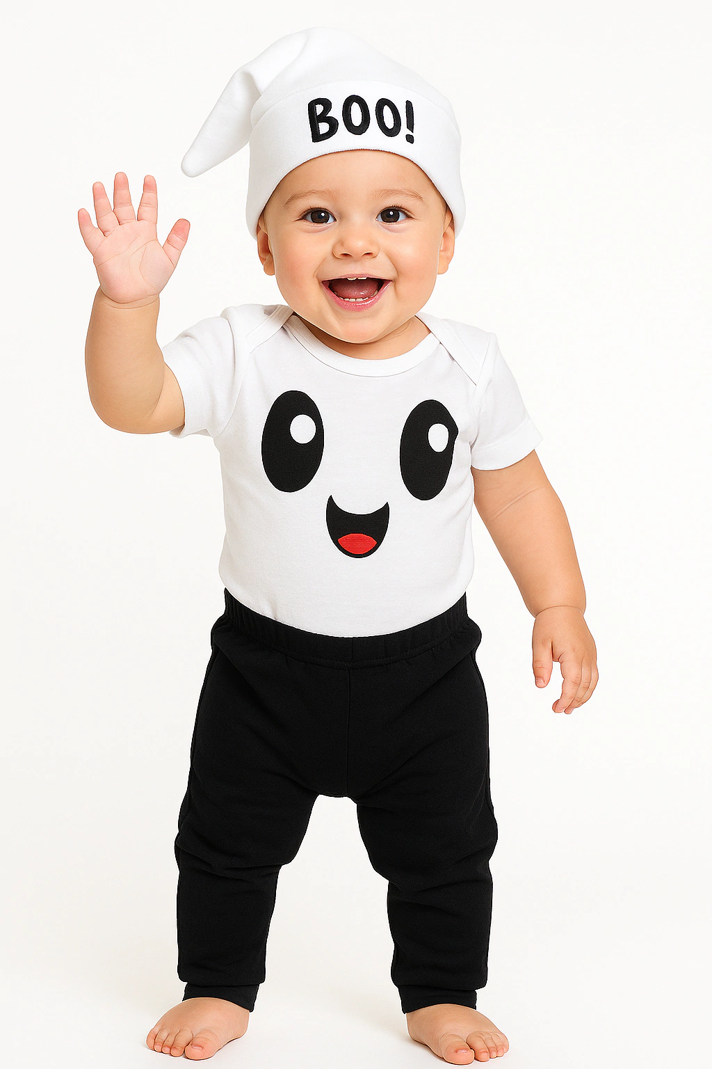 Body Manga Corta HALLOWEEN + Pantalón Interlock Color Negro + Gorrito haciendo juego.