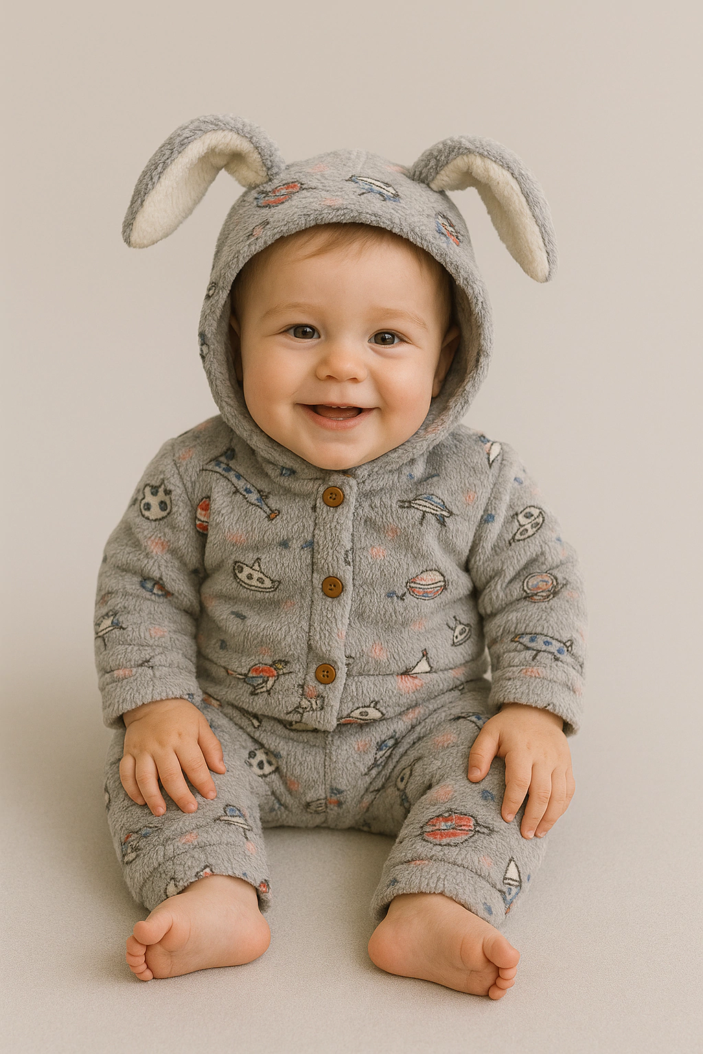 Conjunto Soft Brilla Oscuridad, la opción ideal para que tu bebé disfrute de comodidad y estilo en todo momento. Este conjunto incluye una campera con capucha y orejitas, junto con un pantalón confeccionado en tela soft bifaz, reconocida por su suavidad y calidez.