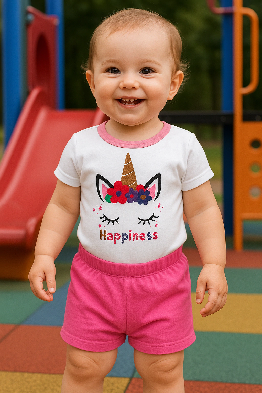 Conjunto de Body Manga Corta de Personaje con broches metálicos + Short liso algodón. Conjunto 100% algodón Calidad Premium.
