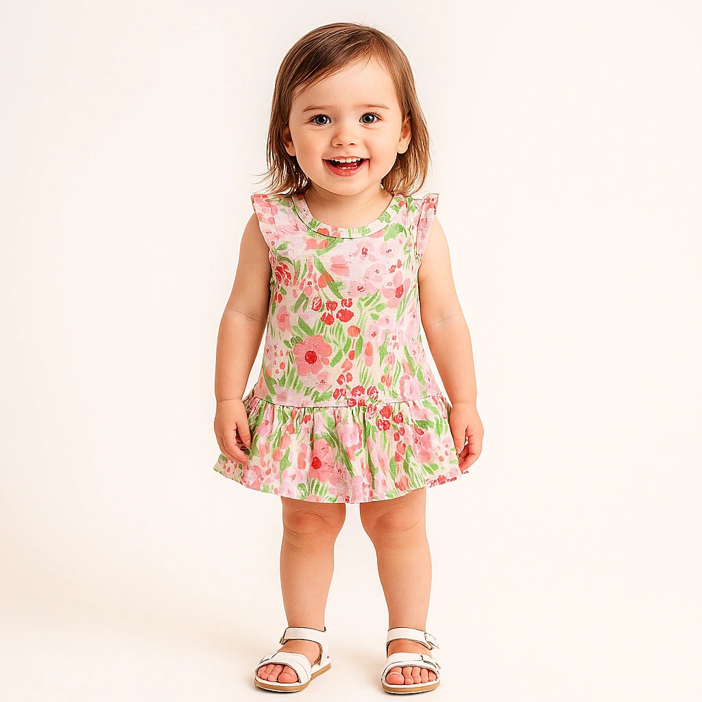 Vestido estampado floreado con volados. 100% algodón Premium - Excelente calidad.