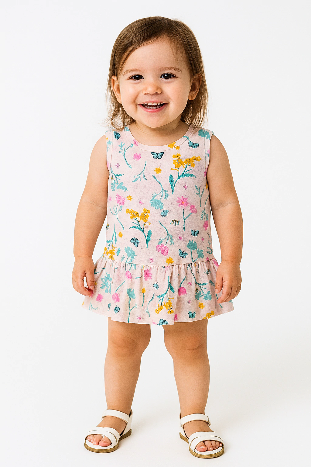 Vestido estampado floreado con volados. 100% algodón Premium - Excelente calidad.